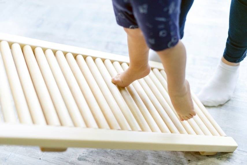 Der große Vorteil: Die Massage geschieht ganz ohne zusätzlichen Aufwand – während das Kind die geneigte Holzplatte hinaufklettert oder hinabrutscht, werden automatisch Füße, Waden und Rücken massiert.