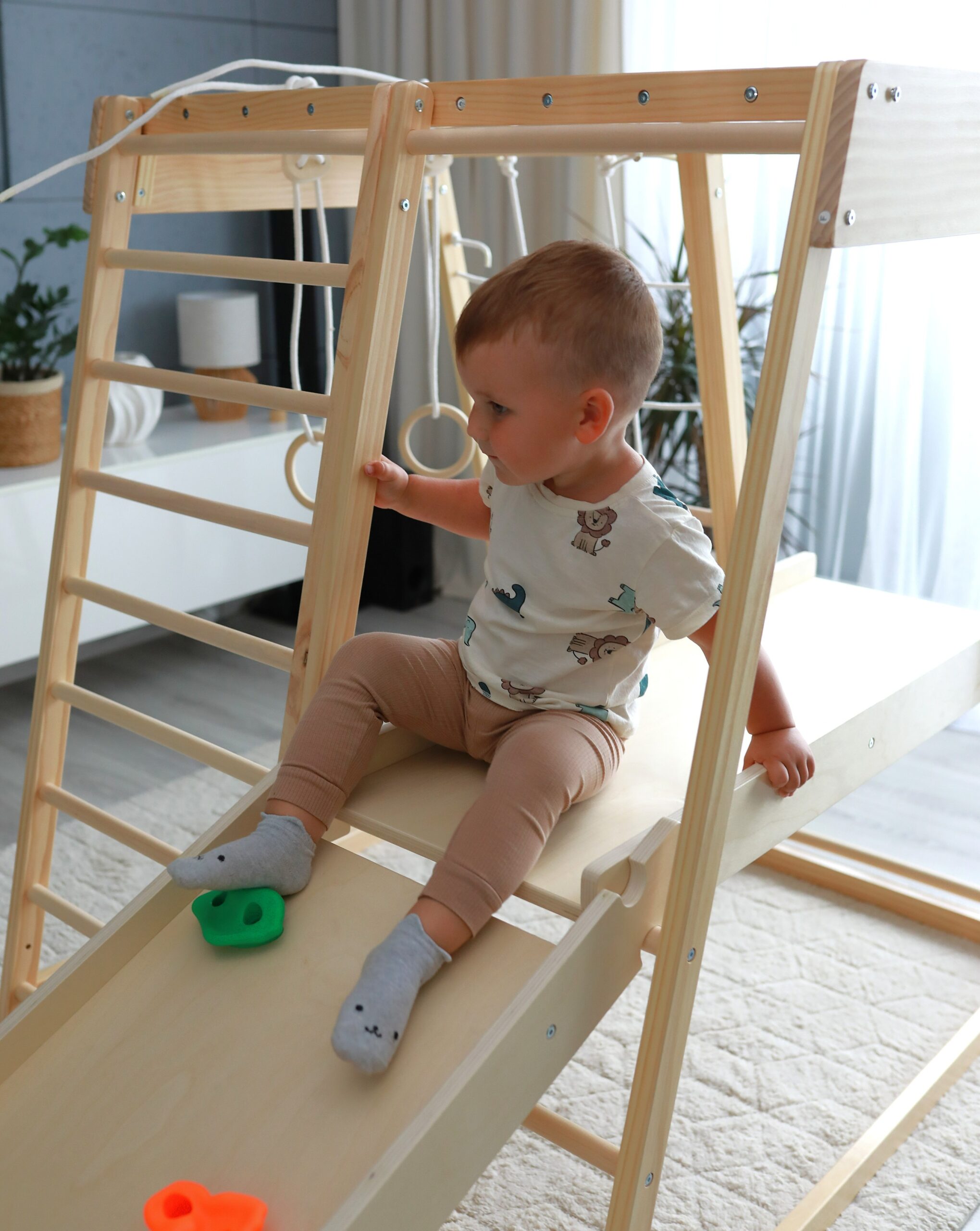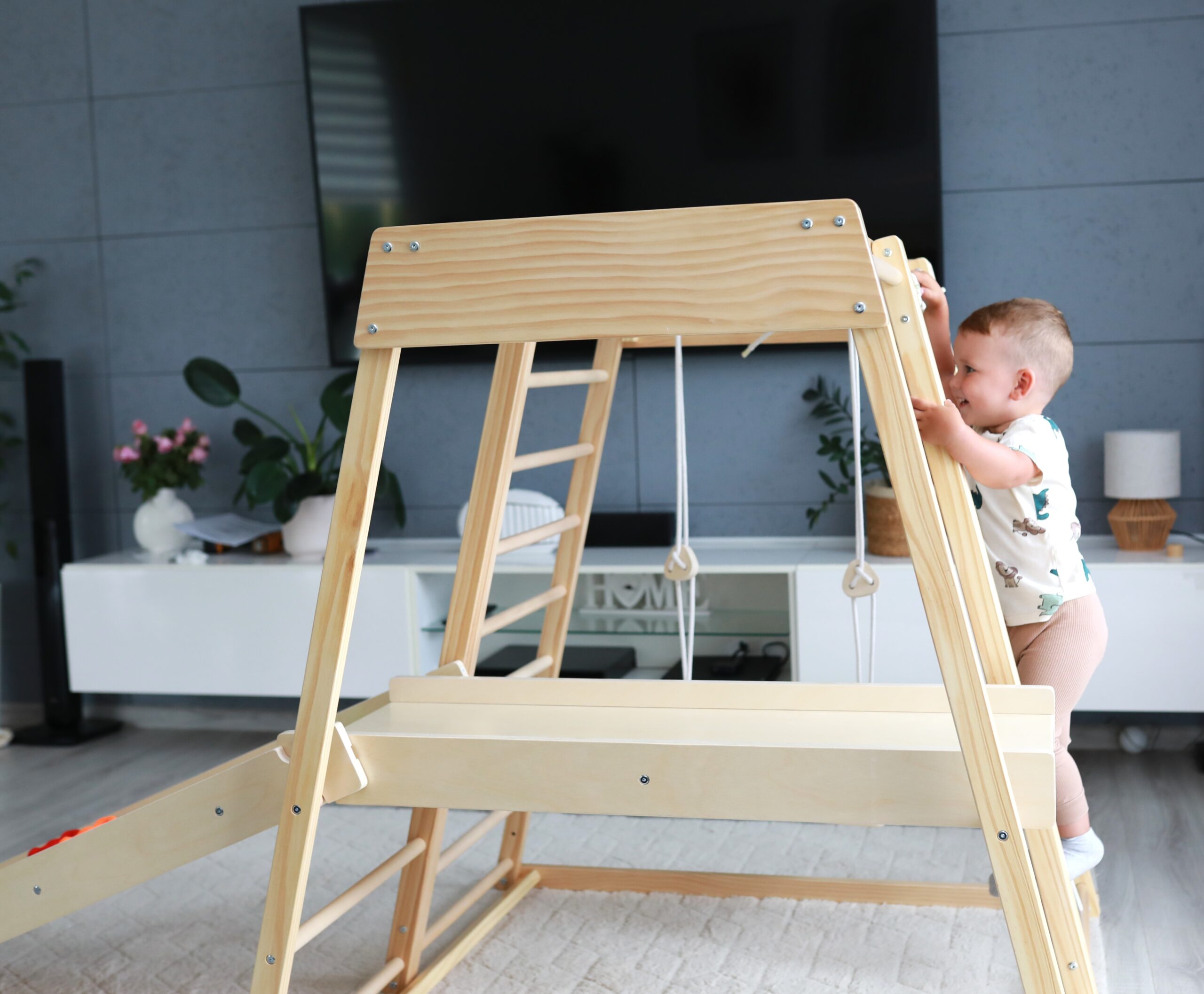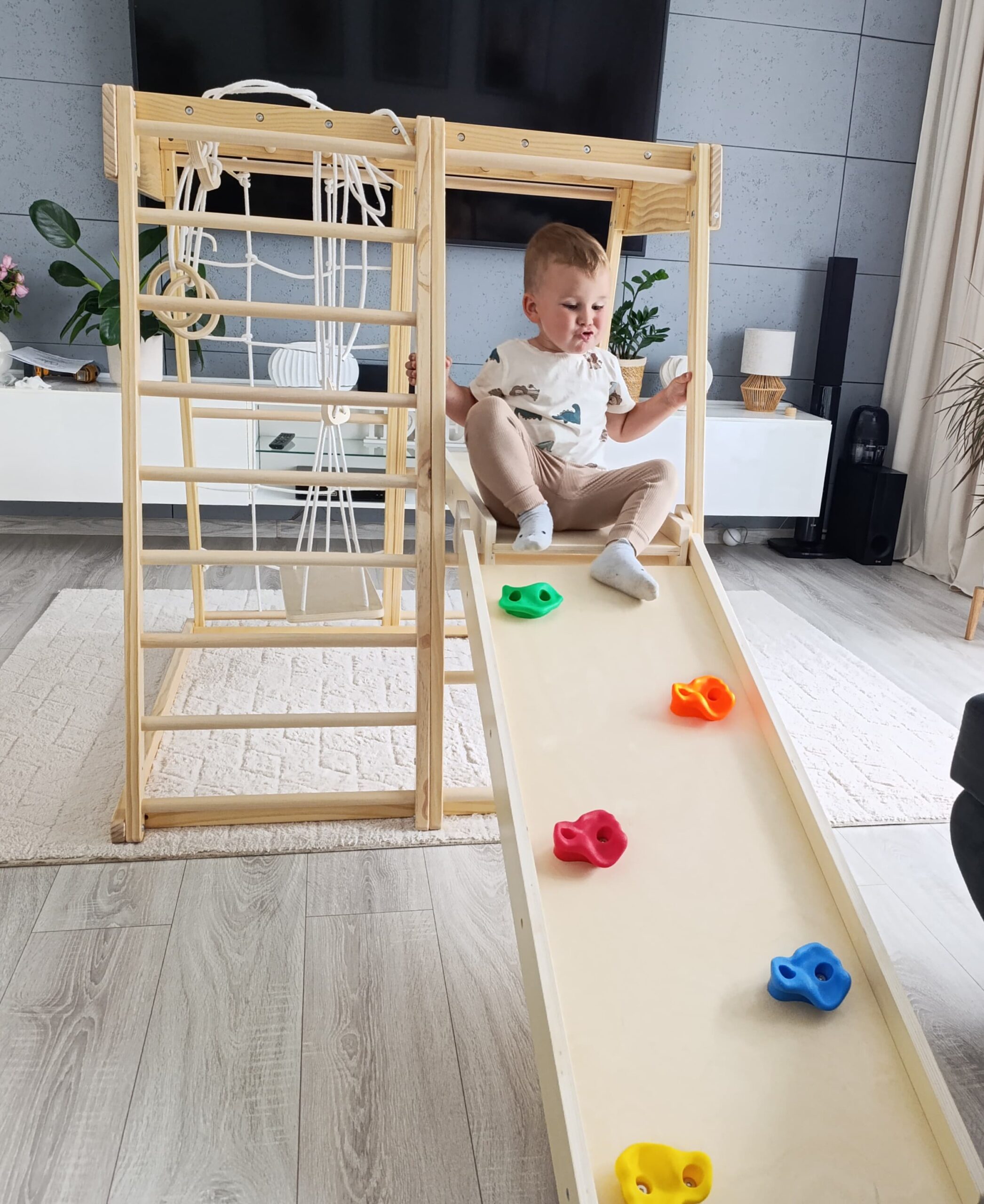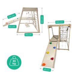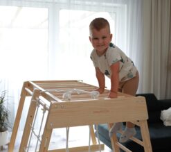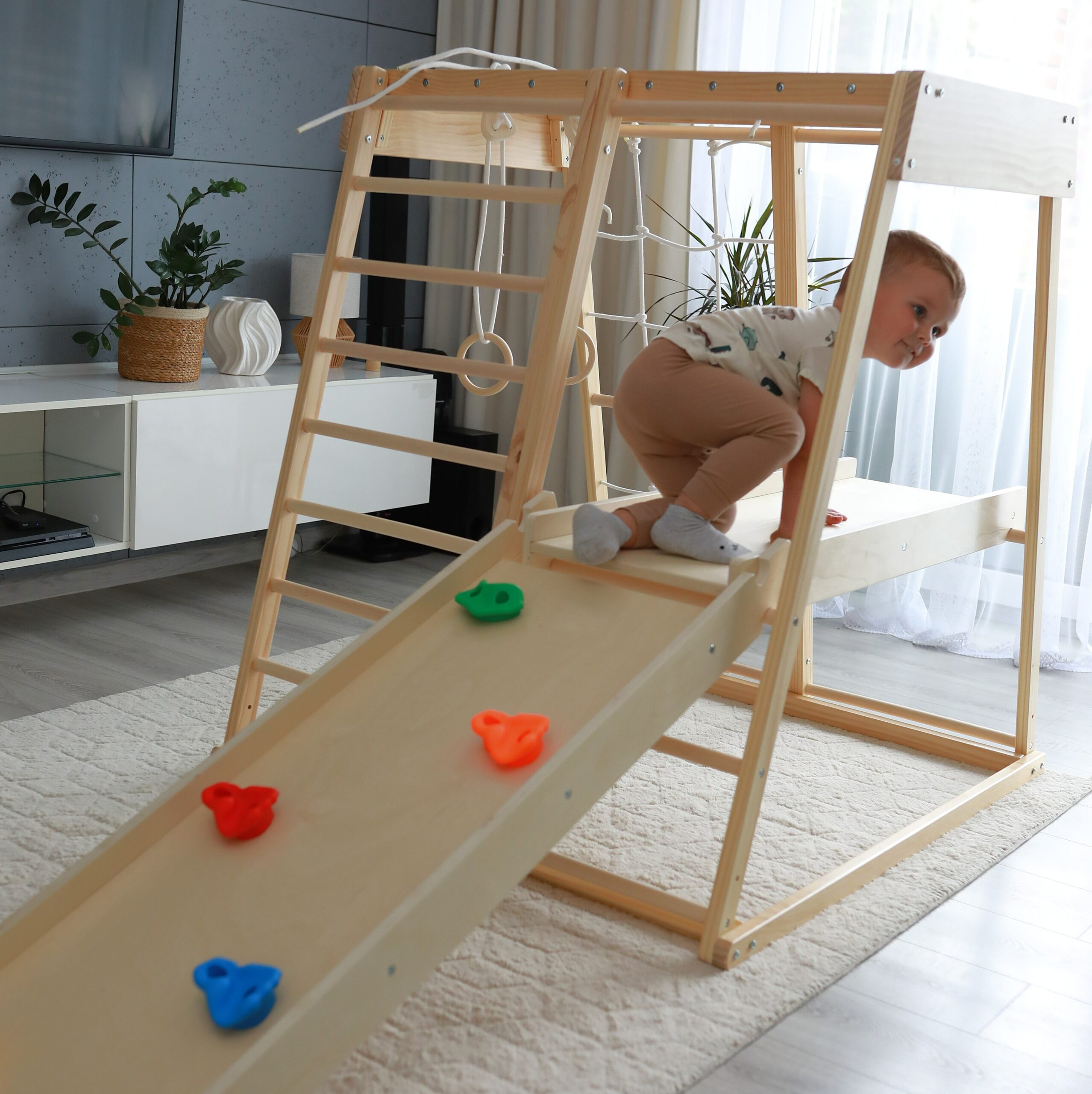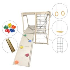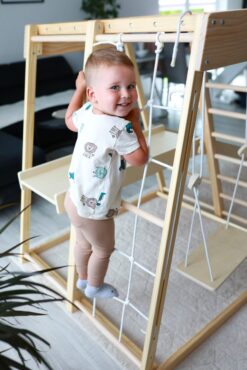Klettern, hangeln, rutschen, sich verstecken – das Klettergerüst für Kinderzimmer bietet vielseitige Bewegungsanreize und fördert Motorik, Koordination und Selbstvertrauen.