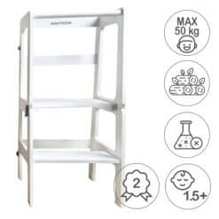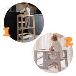 Der Lernturm Kinder bietet einen festen und sicheren Stand, sodass Ihr Kind aktiv am Alltag teilhaben kann – sei es beim Kochen, Zähneputzen oder Tischdecken. Die erhöhte Plattform bringt die Kleinen genau dorthin, wo das Leben passiert – auf Augenhöhe.