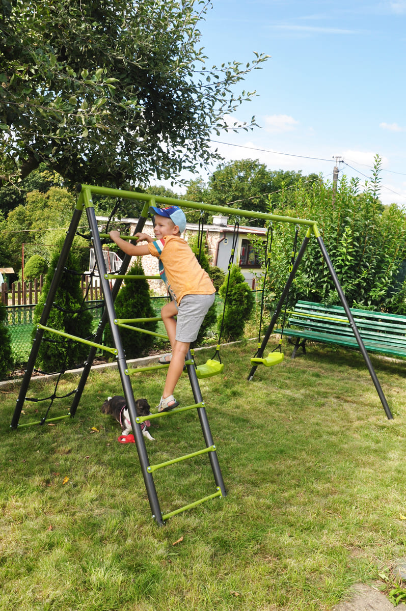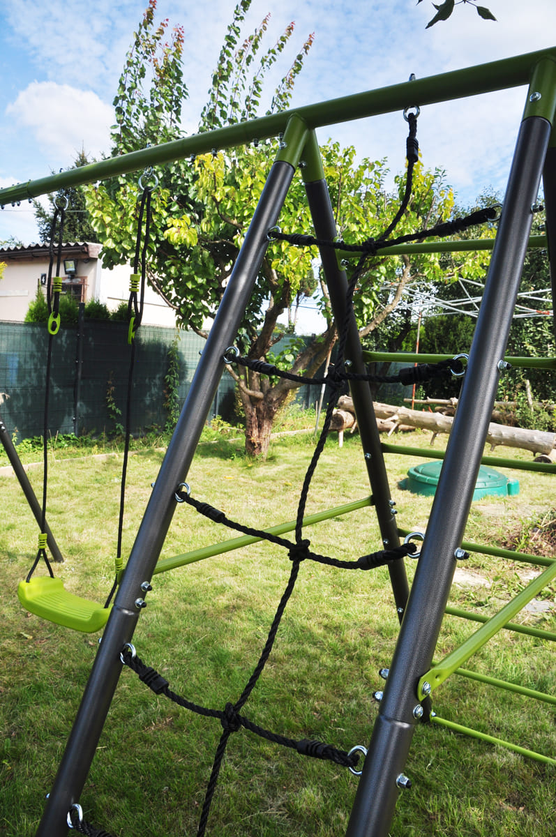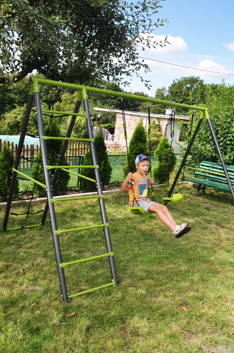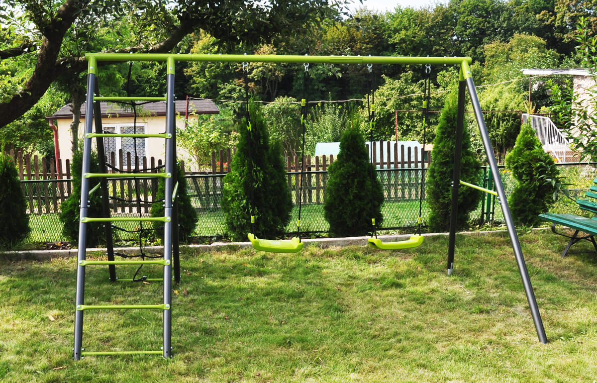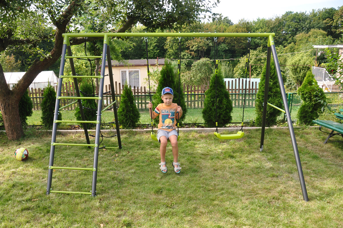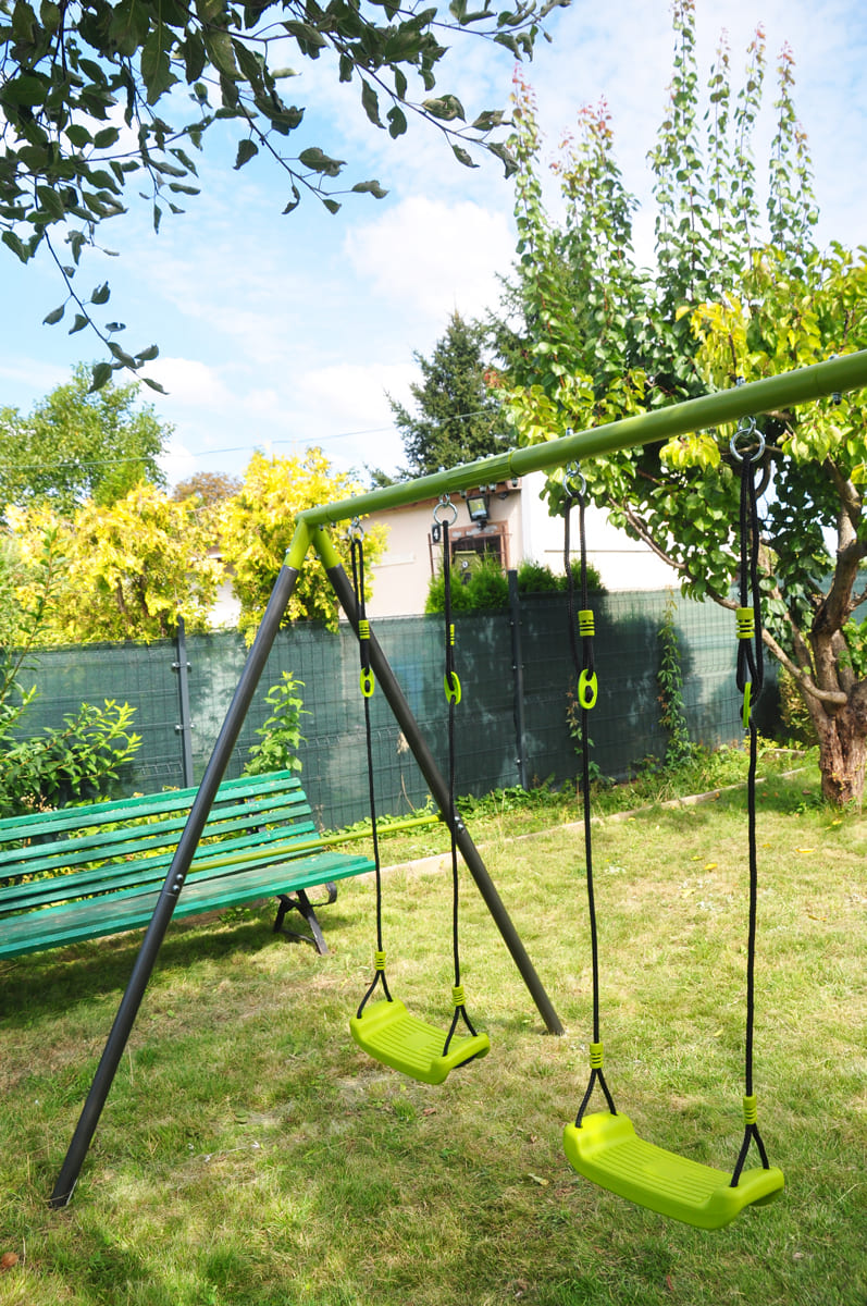 Die Kindergartenschaukel vervollständigt oft das Glück der Kinder im Garten. Die Doppelschaukel, ist auf einem stabilen Metallgestell gefertigt. Dies gewährleistet die Sicherheit und Langlebigkeit des Sets.