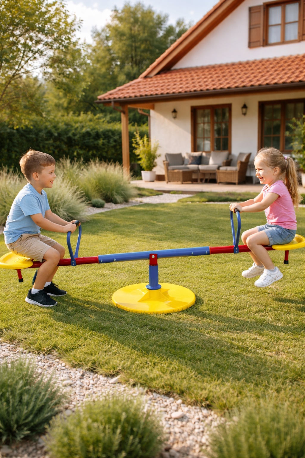 - Ein spezieller Mechanismus ermöglicht es der Schaukel, sich während des Spiels um 360 Grad zu drehen