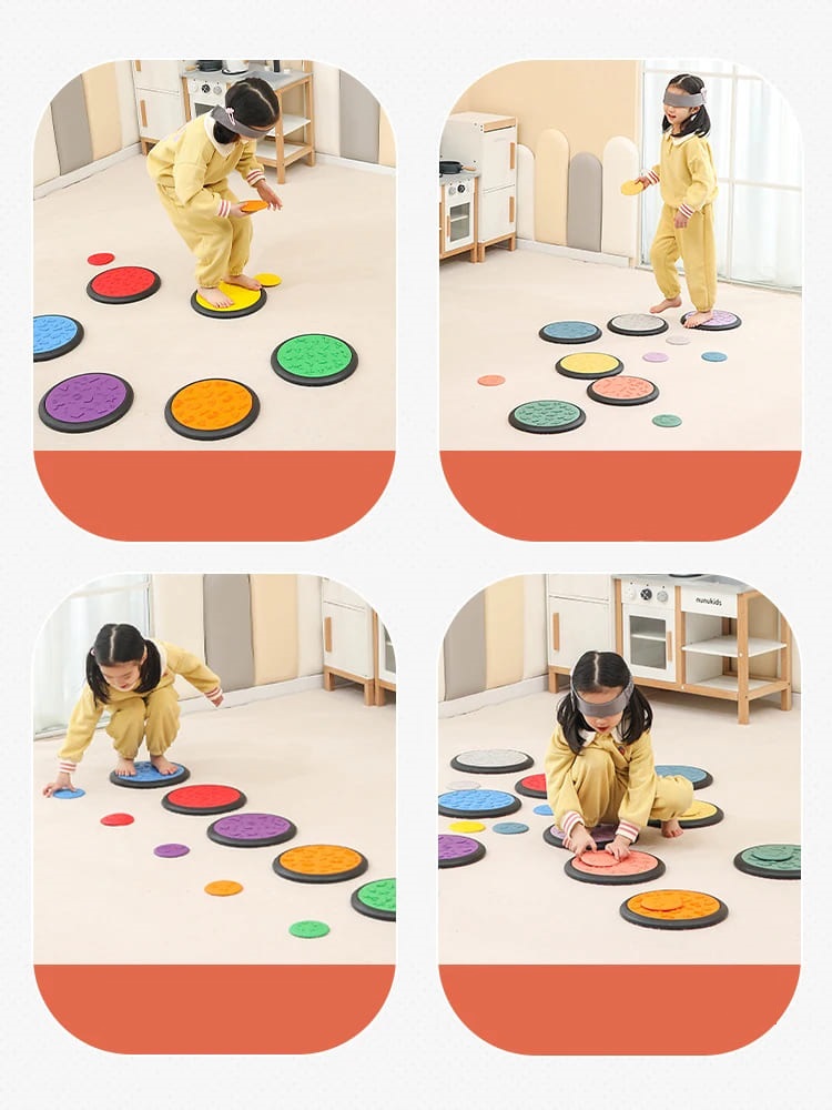 Ob barfuß oder mit verbundenen Augen – das Spiel mit den Scheiben macht Spaß und fördert gleichzeitig Konzentration, Koordination und Gleichgewicht. Ideal für Montessori-Übungen, Ergotherapie oder Bewegungsspiele.