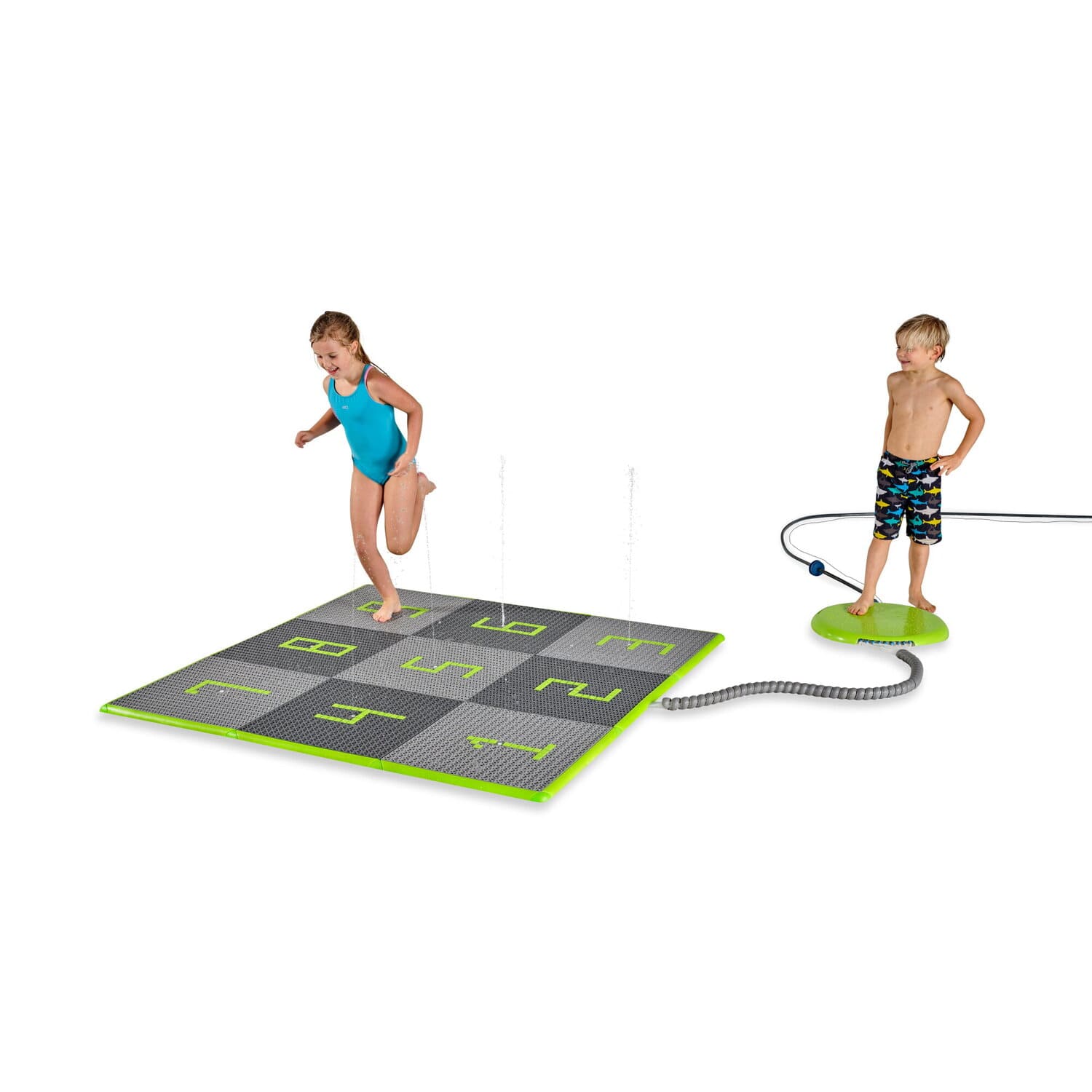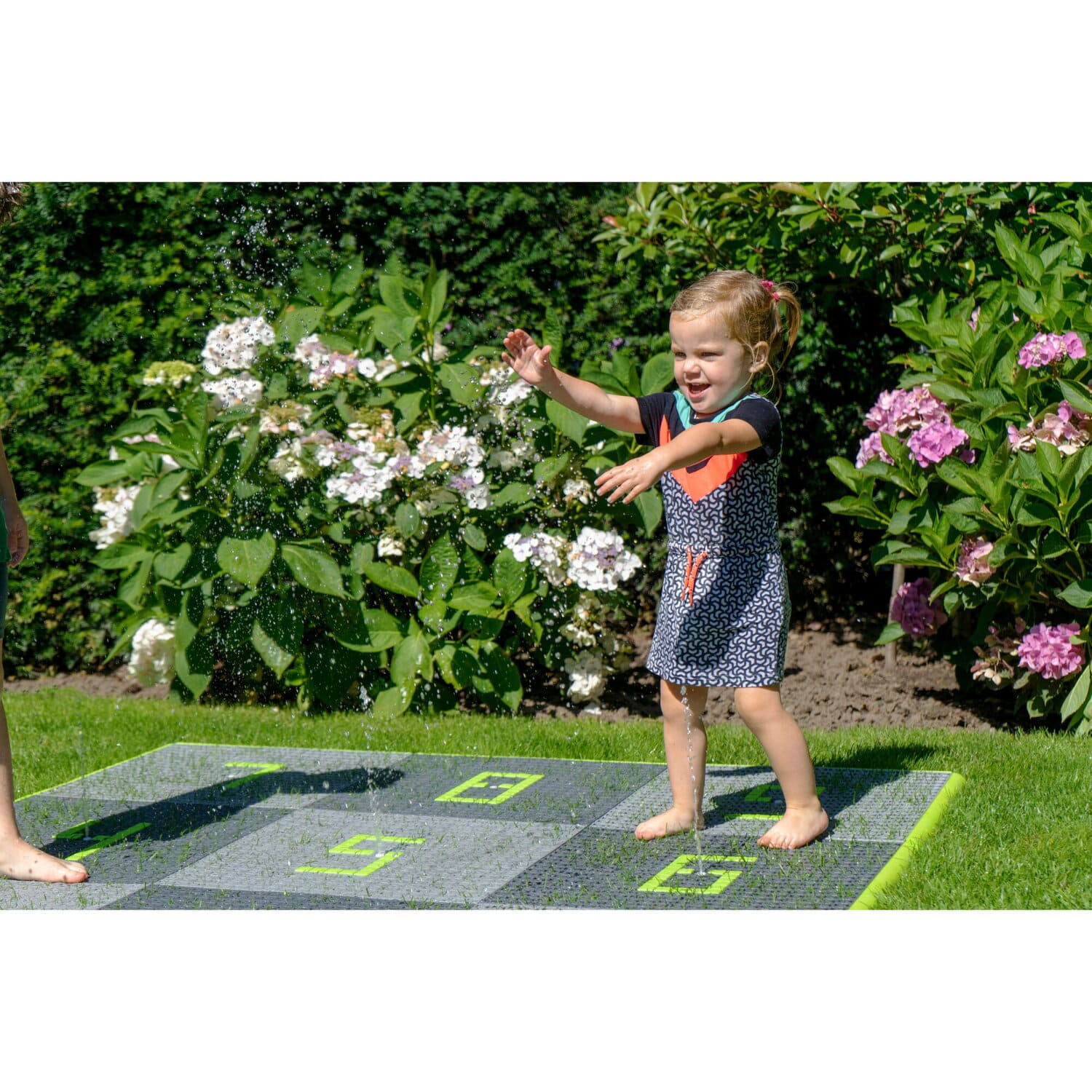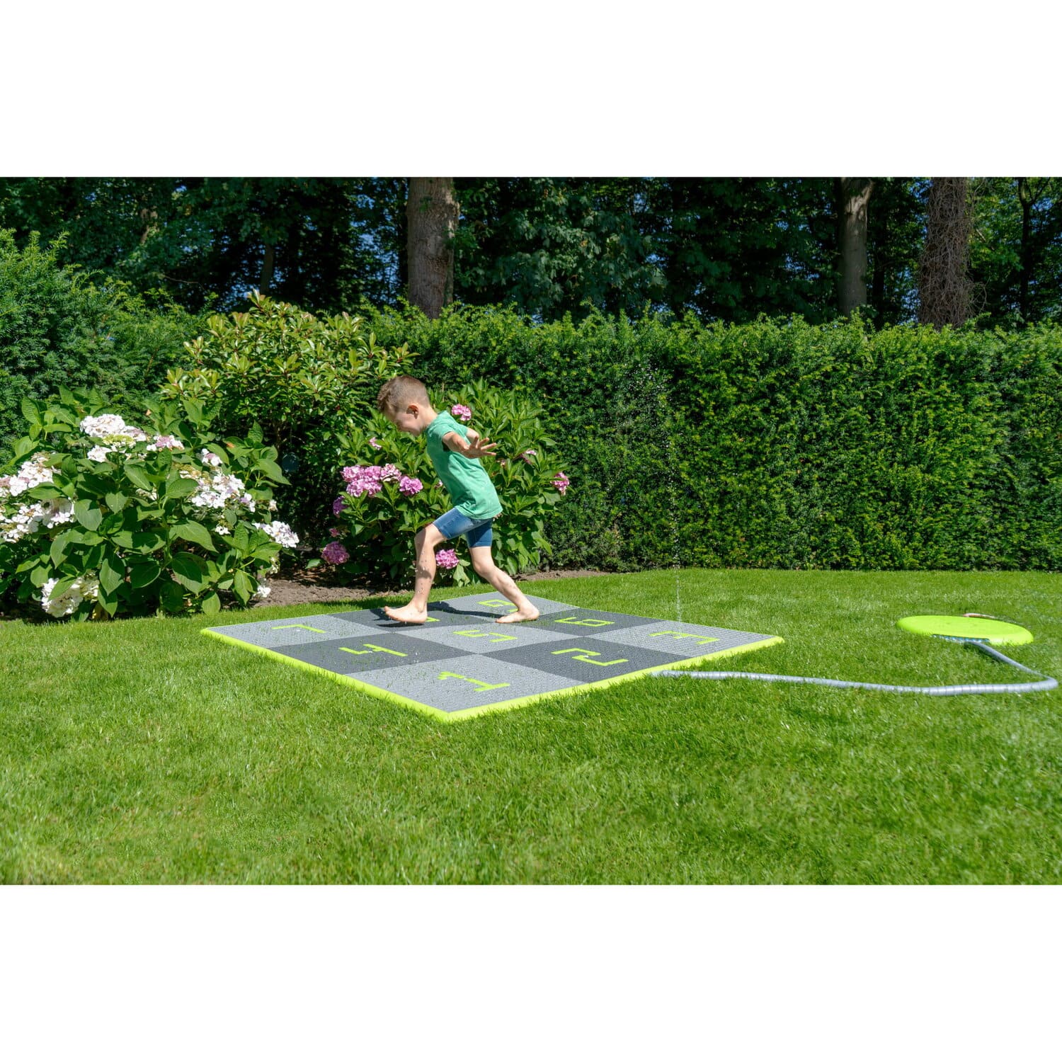 Der interaktive Wasserspielplatz für den Garten hat einen wasserpädagogischen Charakter. Sein Steuerblock wird manuell oder über eine App bedient. Das Set hat die Möglichkeit, die Anordnung der Fliesen von 5 × 5 in ein „Klassenzimmer-Spiel“ Layout zu ändern. Die Fliesen sind sicher, da sie eine rutschfeste Textur haben. Der Wasserspielplatz ist für Kinder ab 3 Jahren geeignet.