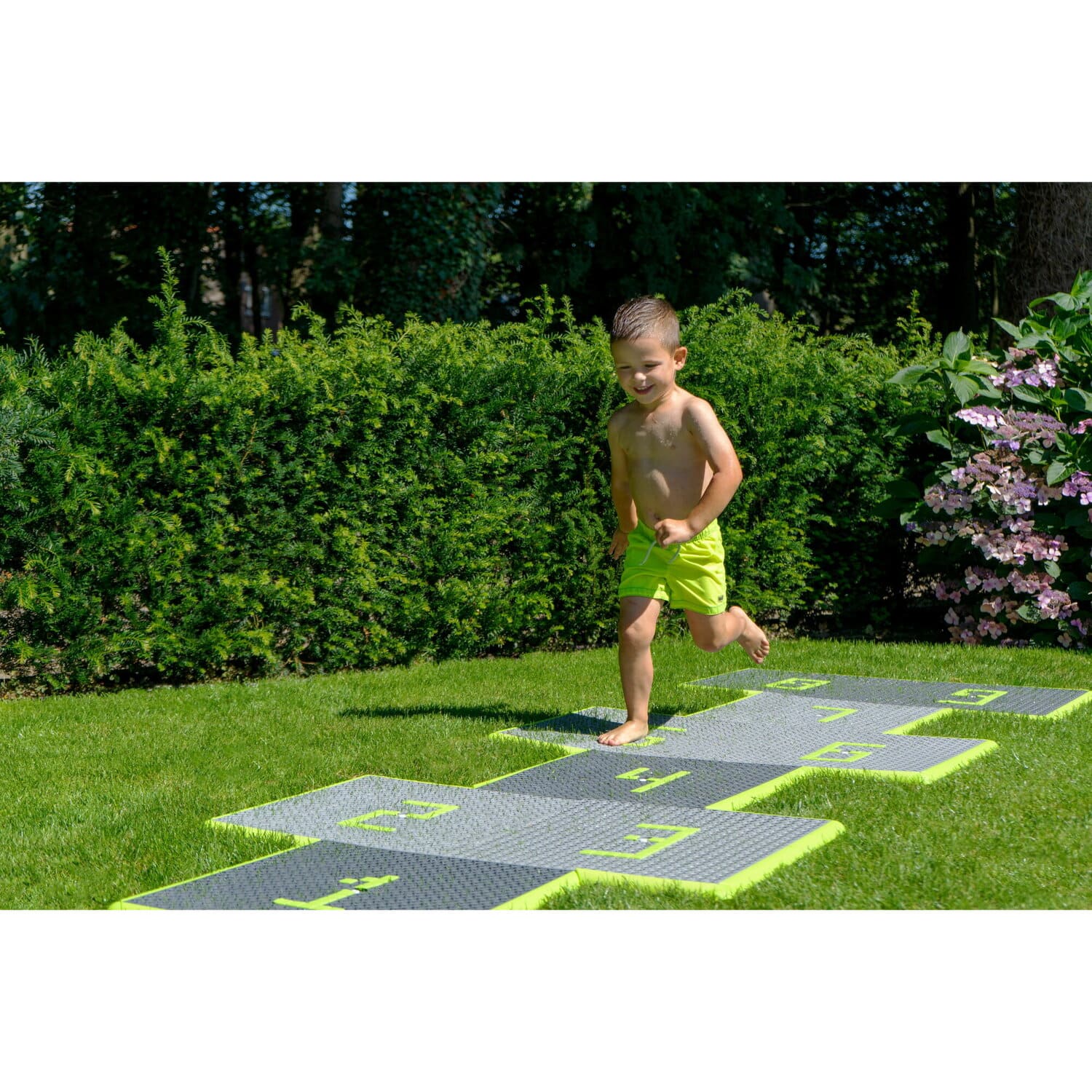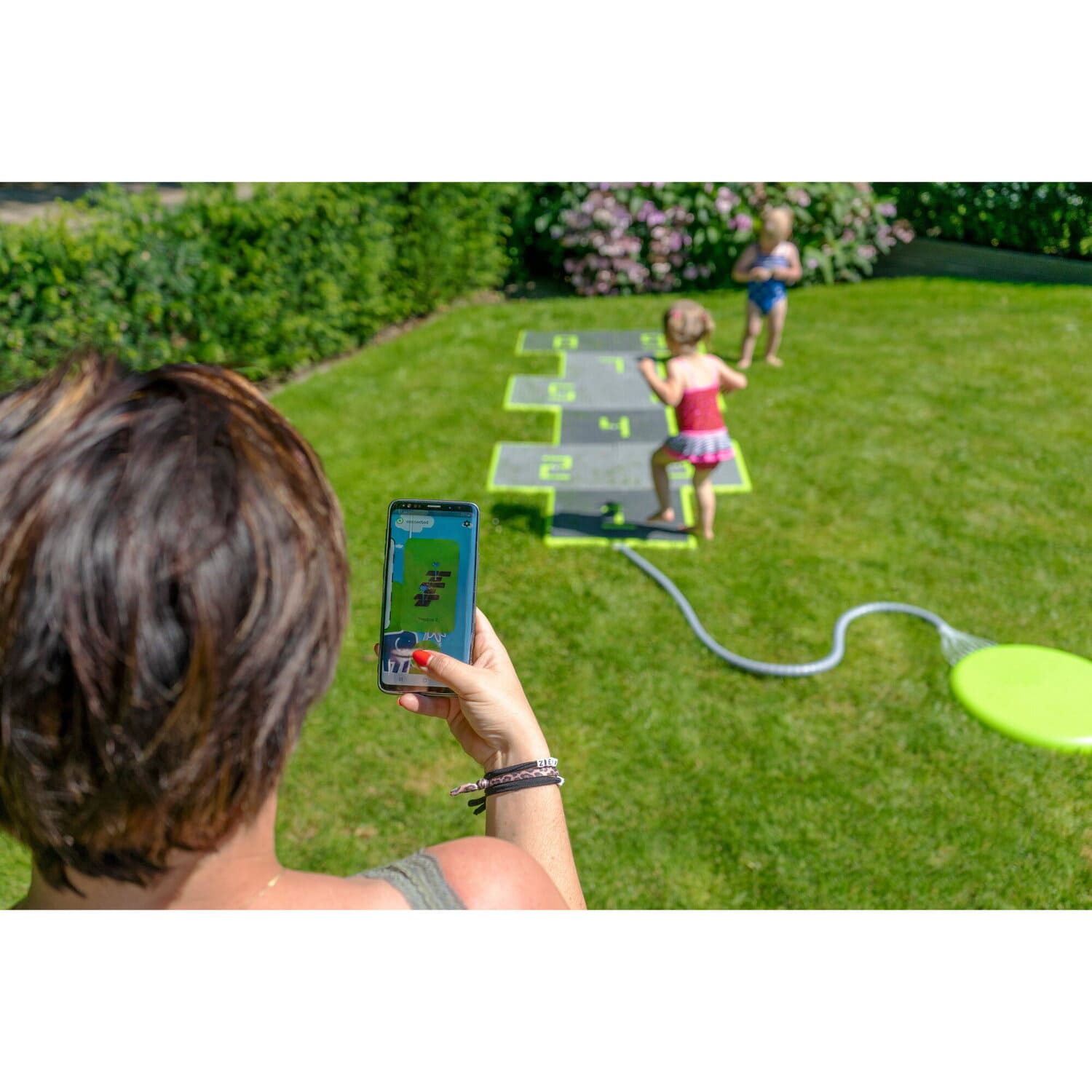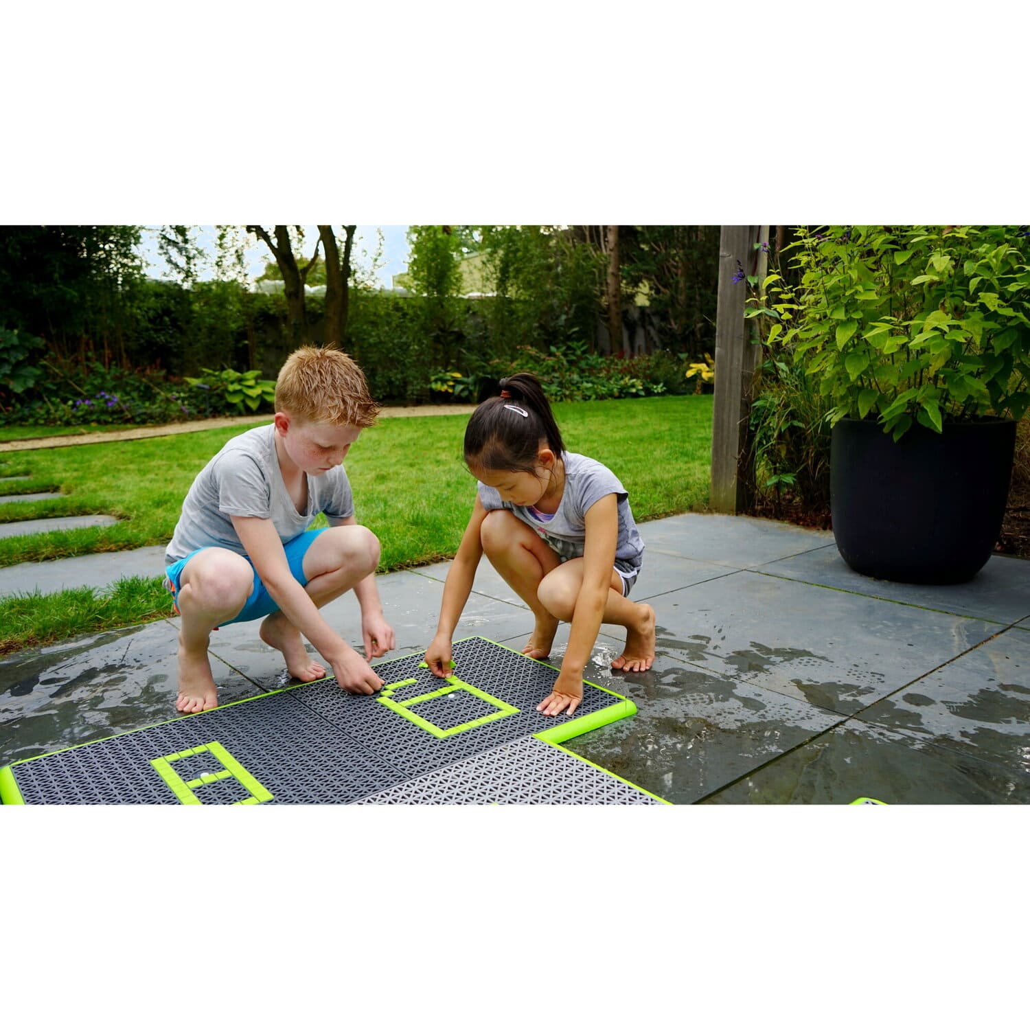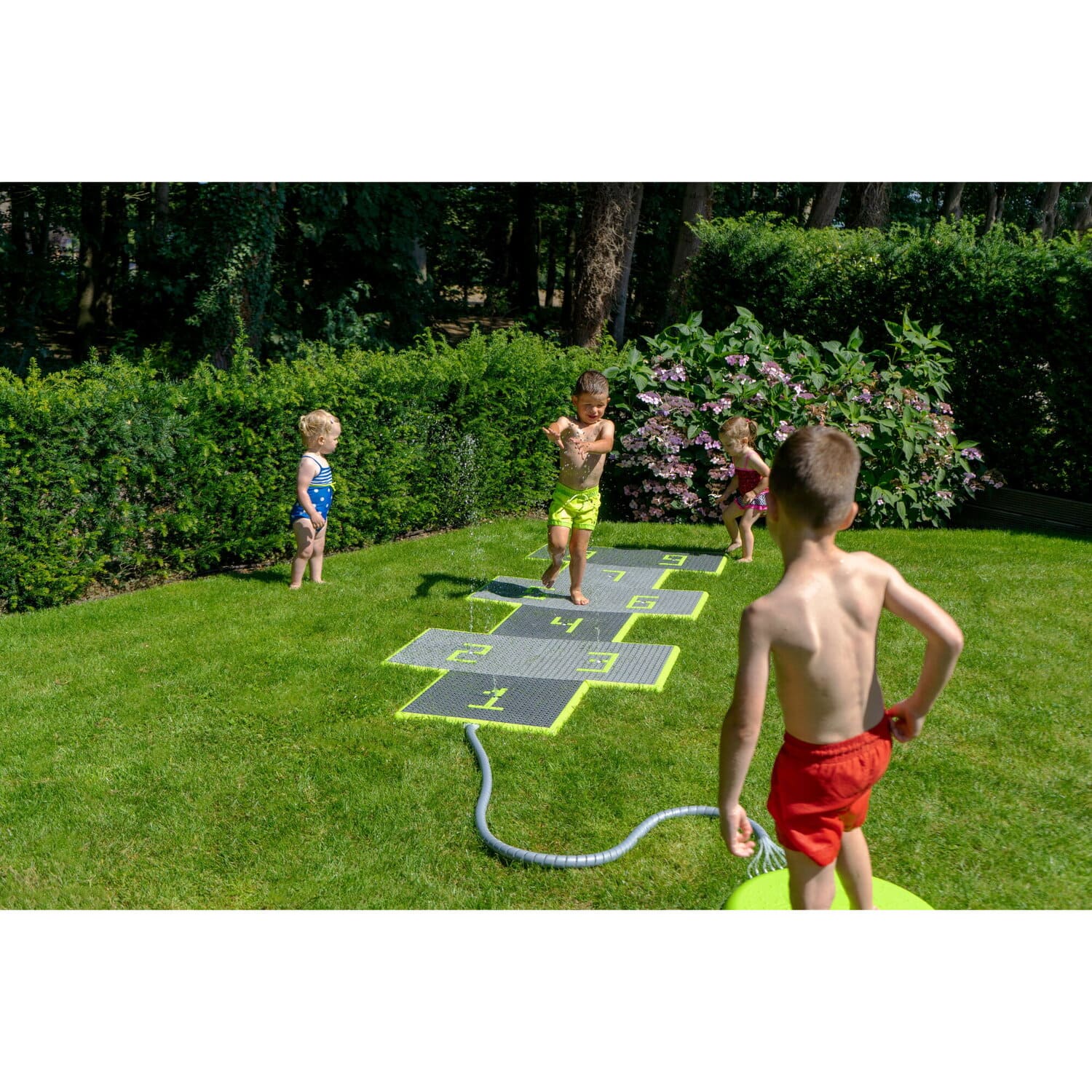 Der interaktive Wasserspielplatz für den Garten hat einen wasserpädagogischen Charakter. Sein Steuerblock wird manuell oder über eine App bedient. Das Set hat die Möglichkeit, die Anordnung der Fliesen von 5 × 5 in ein „Klassenzimmer-Spiel“ Layout zu ändern. Die Fliesen sind sicher, da sie eine rutschfeste Textur haben. Der Wasserspielplatz ist für Kinder ab 3 Jahren geeignet.