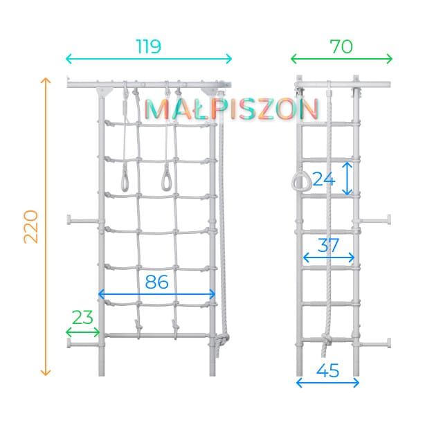- Montage: Wandmontage, Kletternetz kann sowohl auf der rechten als auch auf der linken Seite des Sportsets montiert werden