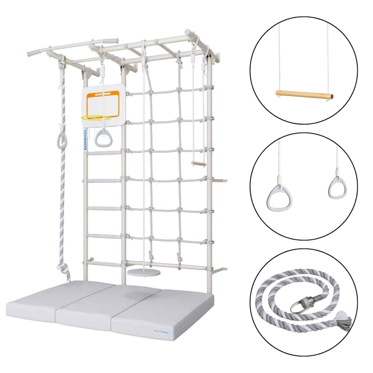 - Belastbarkeit: 100 kg (Sprossenwand), 50 kg (Zubehör)