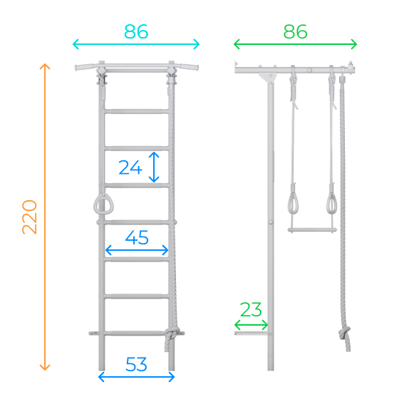 - Belastbarkeit: 100 kg (Sprossenwand), 50 kg (Zubehör)