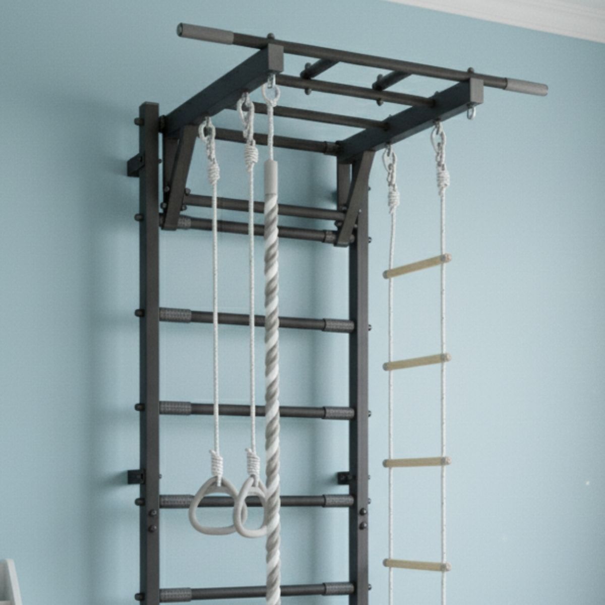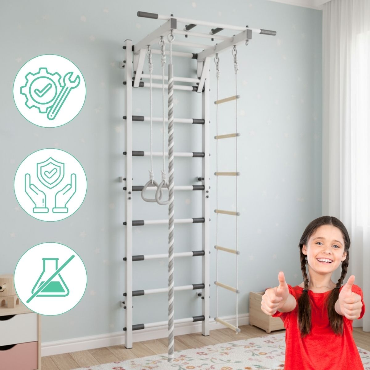 Die Sprossenwand im Kinderzimmer Trick bietet Kindern einen Raum, in dem sie ganz bei sich sein können – in Bewegung, im Spiel, im Ausprobieren. Sie stärkt den Körper, schärft die Sinne und gibt Selbstvertrauen.