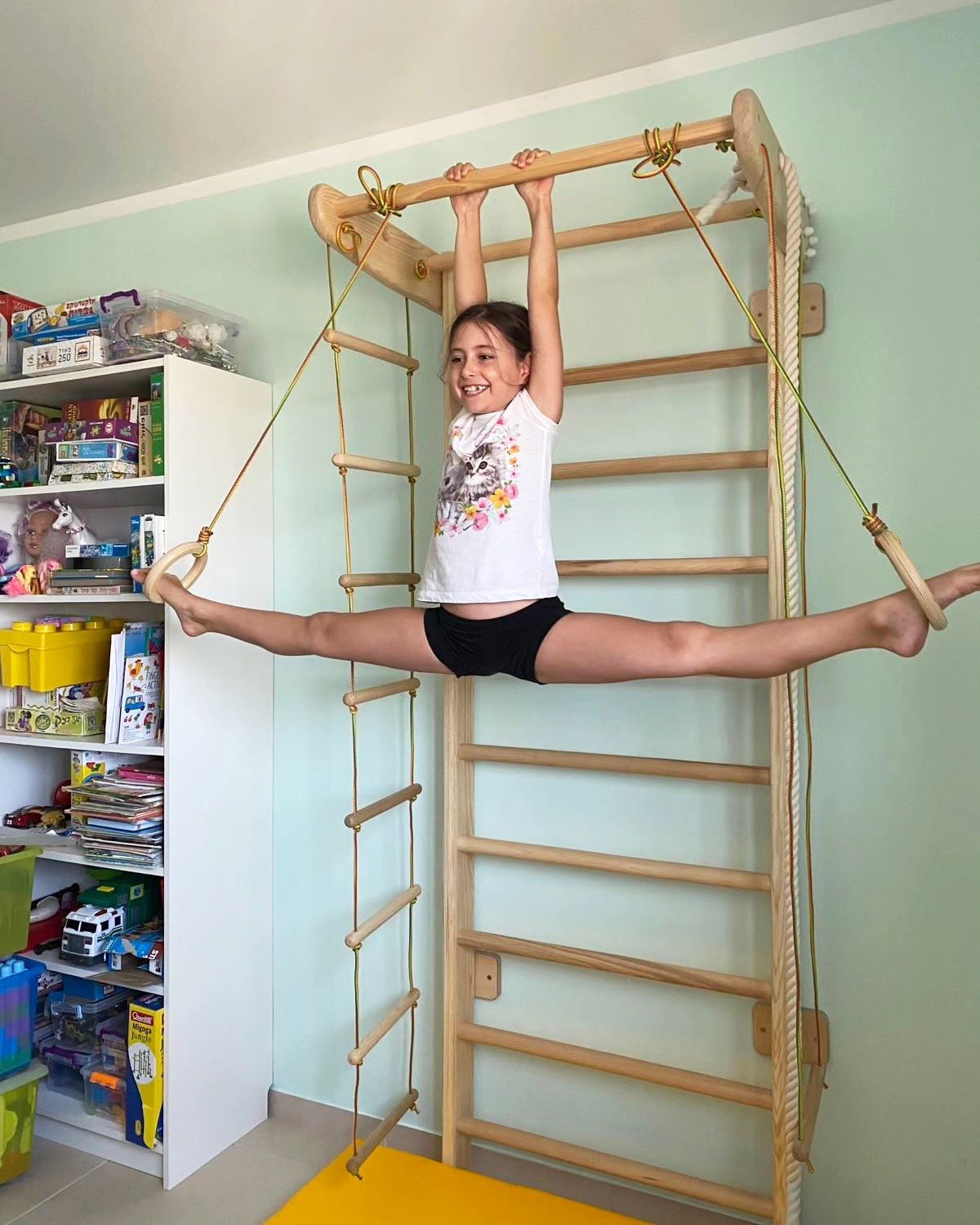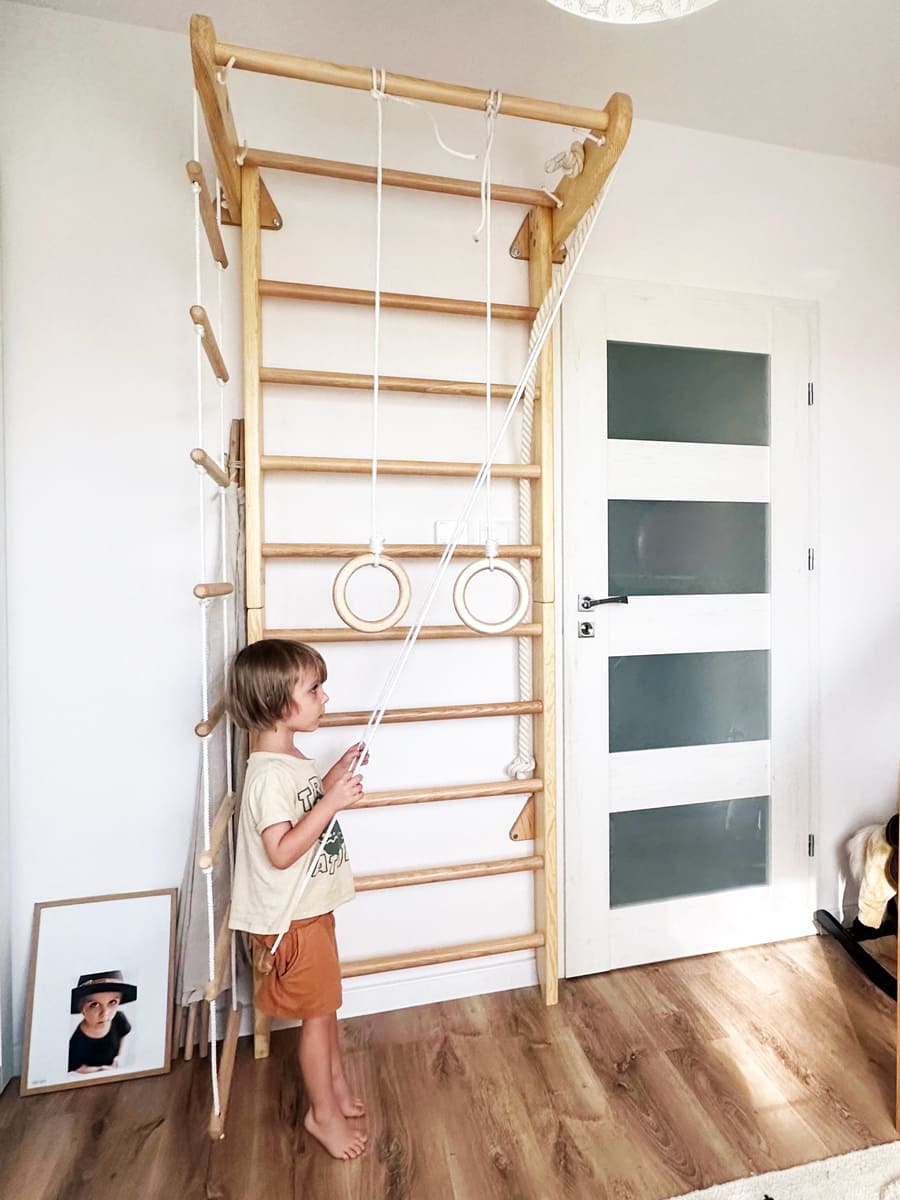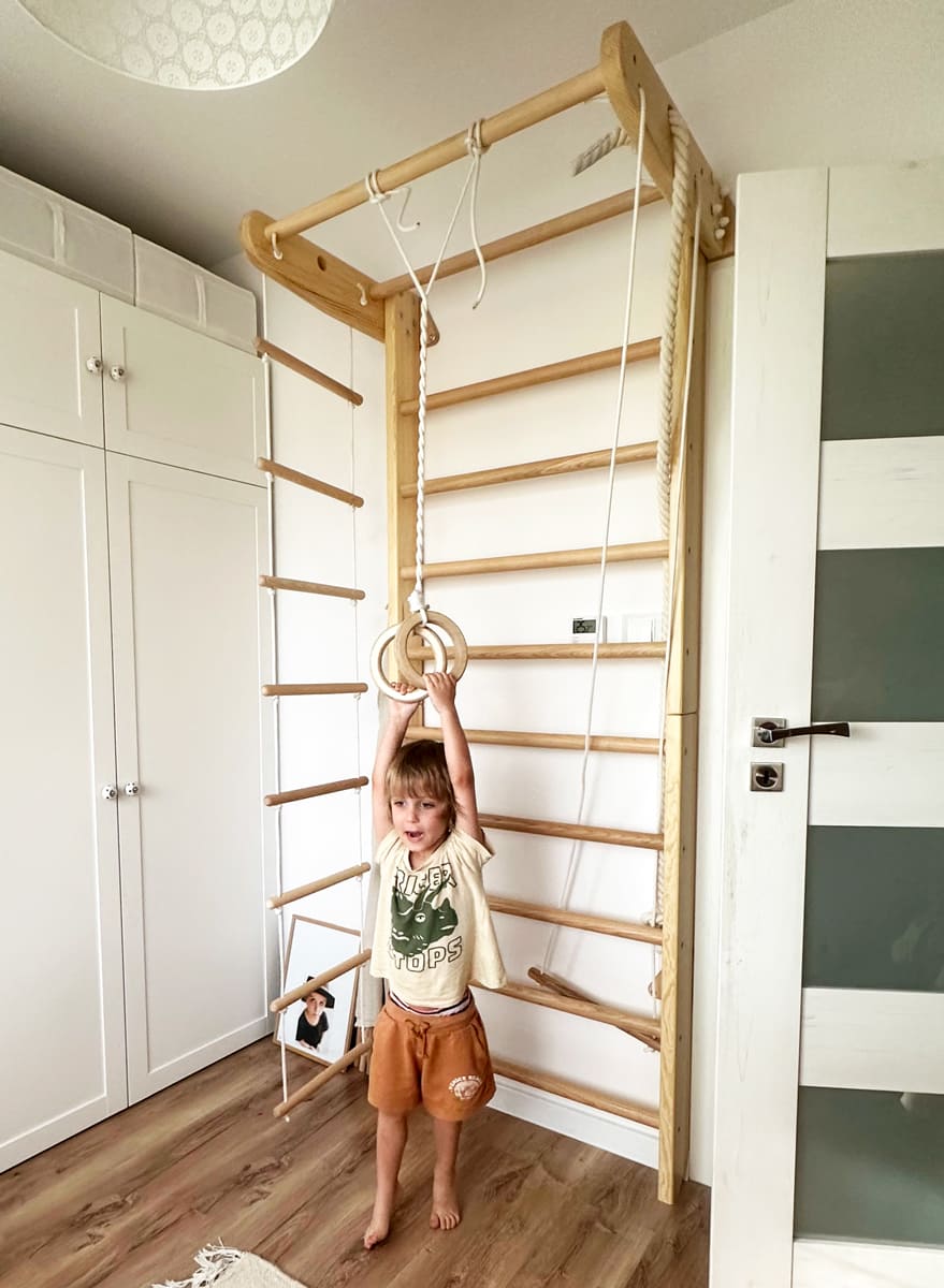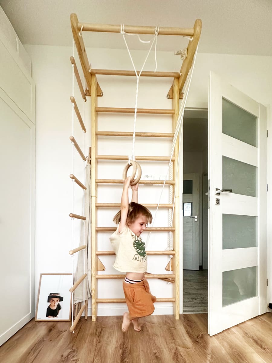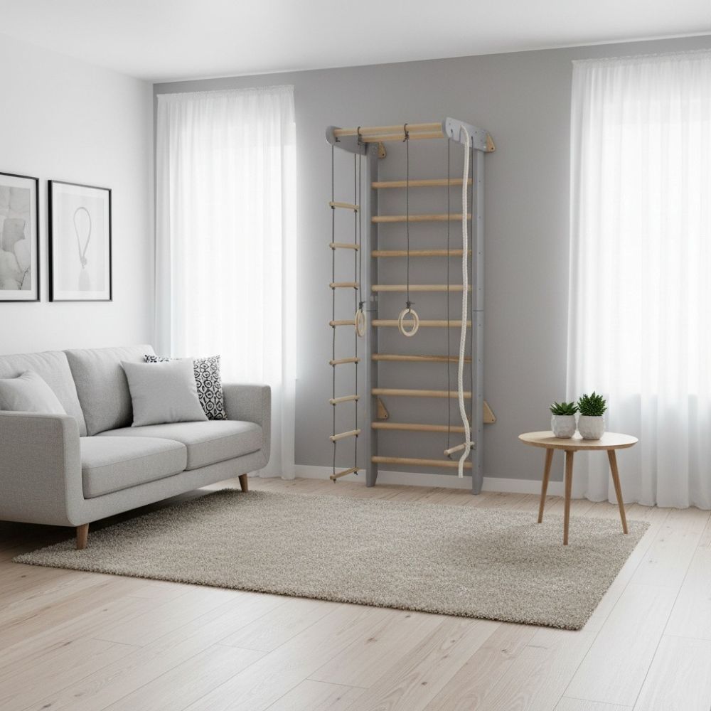 Als Sprossenwand im Kinderzimmer ist sie ein sicherer Rückzugs- und Bewegungsort zugleich. Und weil sie bis zu 120 kg trägt, können auch Mama und Papa mitturnen, dehnen oder einfach ein paar Minuten am Tag aktiv bleiben. So wird Bewegung zu einem Teil des Familienalltags – unkompliziert und natürlich.